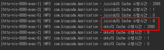 즉, 한번 캐시된 데이터는 해당 메소드를 실행시키지 않고 캐시된 데이터를 그대로 전달 한다는 것을 확인할 수 있다.