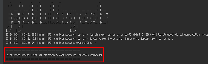 프로젝트를 구동시키면 아래와 같이 현재 CacheManager가 EhCache임을 알려준다.