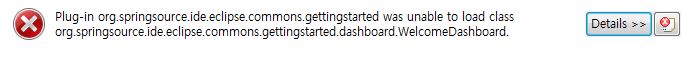 "Plug-in org.springsource.ide.eclipse.commons.gettingstarted was unable to load class org.springsource.ide.eclipse.commons.gettingstarted.dashboard.WelcomeDashboard."