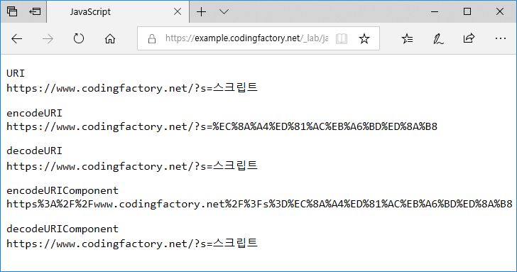 - decodeURIComponent() : encodeURIComponent()로 인코딩한 문자열을 디코딩하는 함수입니다.