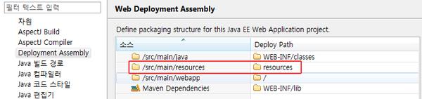 이 전략은 다음과 같습니다. 먼저 디스패처 서블릿을 통해 들어온 요청을 처리하는데 만약 디스패처 서블릿이 해당 요청에 대한 컨트롤러가 찾을 수 없다면 2차적으로 위의 설정된 경로를 검색하여 해당 자원을 찾아내게 되는 것이죠. 저같은 경우는 기존의 resources폴더의 Depoloyment Assembly를 변경하여 아래와 같이 설정하는 것으로 문제를 해결했습니다.